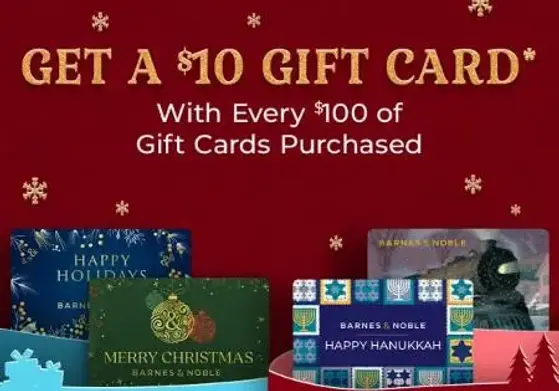 Get a $10.00 Barnes & Noble Gift Card with each purchase of $100.00 or more worth of Barnes & Noble Gift Cards in a single transaction only at Barnes & Noble retail bookstores. This offer is valid only on purchases of Barnes & Noble Gift Cards totaling $100.00 or more in a single transaction only at Barnes & Noble retail bookstores.  This promotion starts on October 31, 2025 and expires December 11, 2025 at close of business. The value of your Gift Card purchase must total at least $100.00 to qualify for the $10.00 Barnes & Noble Gift Card reward. Sales tax, gift wrap, shipping and handling charges, processing charges, or any additional charges will not count towards the qualifying $100.00 Barnes & Noble Gift Card purchase amount. Limit of $50.00 Barnes & Noble Gift Card rewards per customer per day.  You will receive the $10.00 Barnes & Noble Gift Card reward after making your $100.00 qualifying purchase.